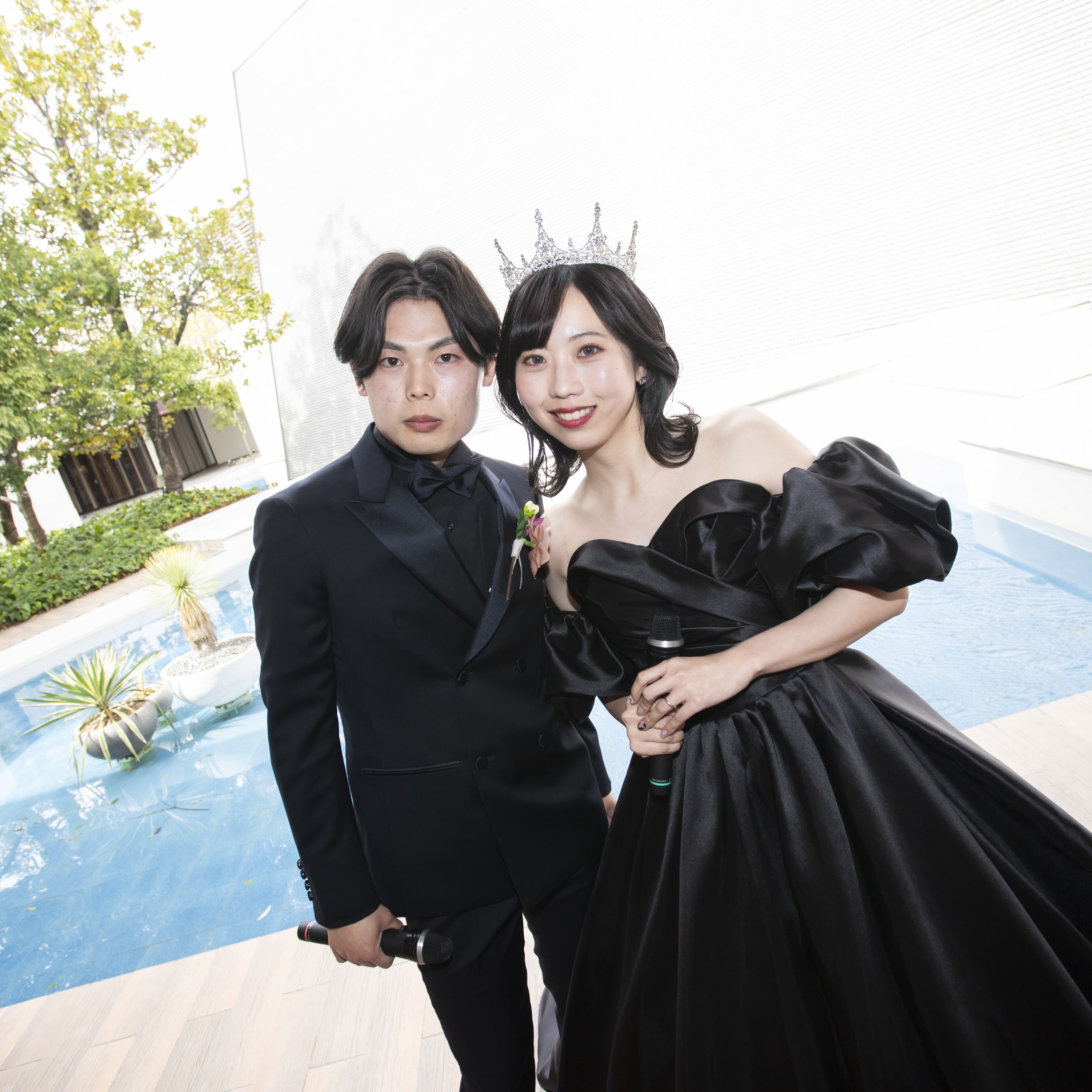 愛犬が参加できること、食事が美味しいことの次にこだわったのが私たちにとって非常に重要な音楽を活かした式にすることでした。CDショップでのアルバイトがきっかけで出会ったのでフェスやライブの演出、ペーパーアイテム、ウェルカムスペースの装飾にはすごくこだわりました。お色直し後の入場の際にはプロジェクションマッピングの後ろで2人で歌を歌い、カーテンが開いたときにゲストの皆さんと対面するという演出をしました。前例がない中で演出担当の方にご対応いただき、ライブ感満載の披露宴にすることができました。自分たちが実現したいコンセプトにとことん寄り添ってくださる姿を見てアクアデヴューを選んで良かったと思っています!