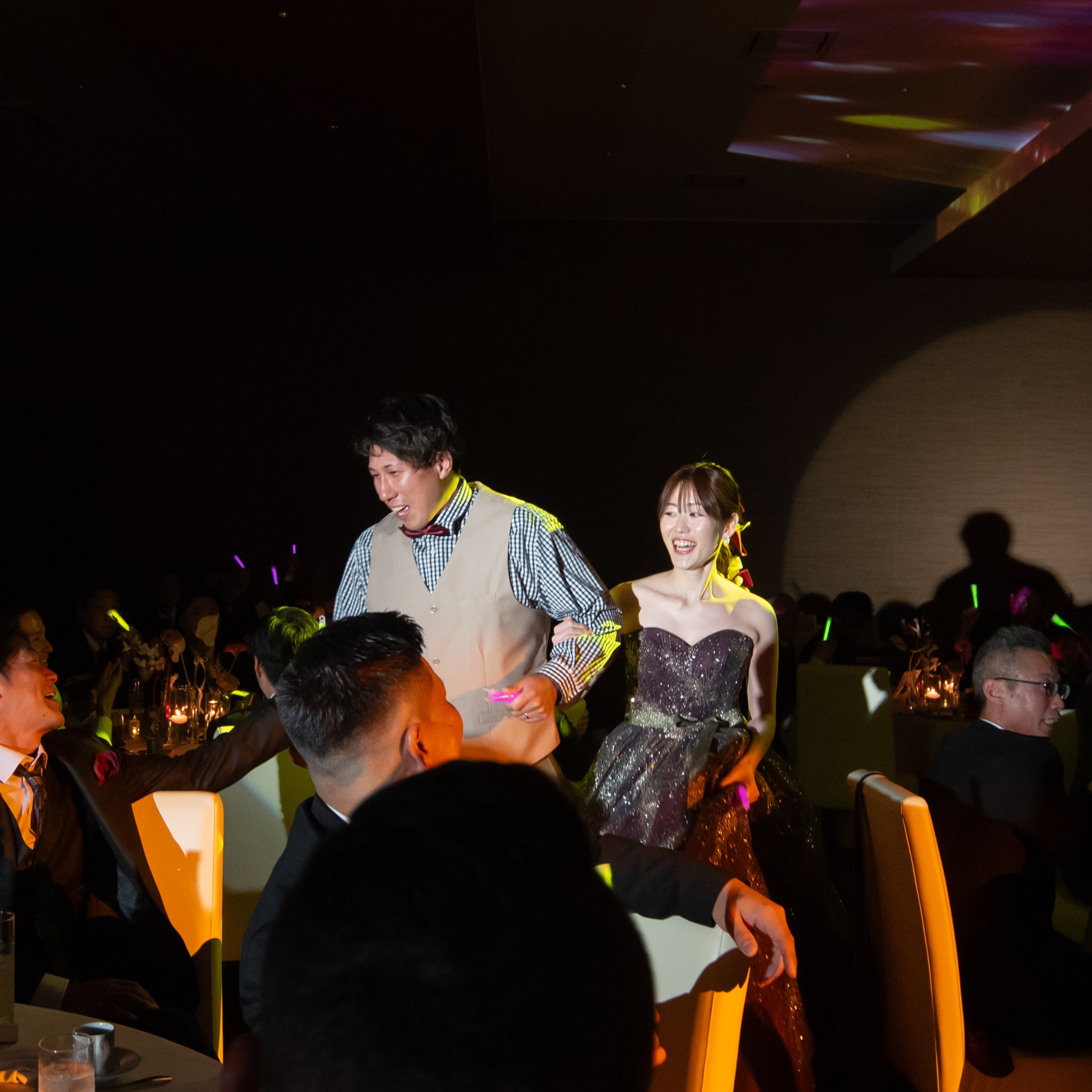 披露宴は最初から最後まで盛り上がって、たくさんのゲスト様の笑顔が見れてよかったです。新婦のドレスが落ちてきて気になっていましかだ、すぐにメイクさんが声掛けて下さったりと式場スタッフの方はみんなちゃんと私たち夫婦を見て下さっているなと感じました。