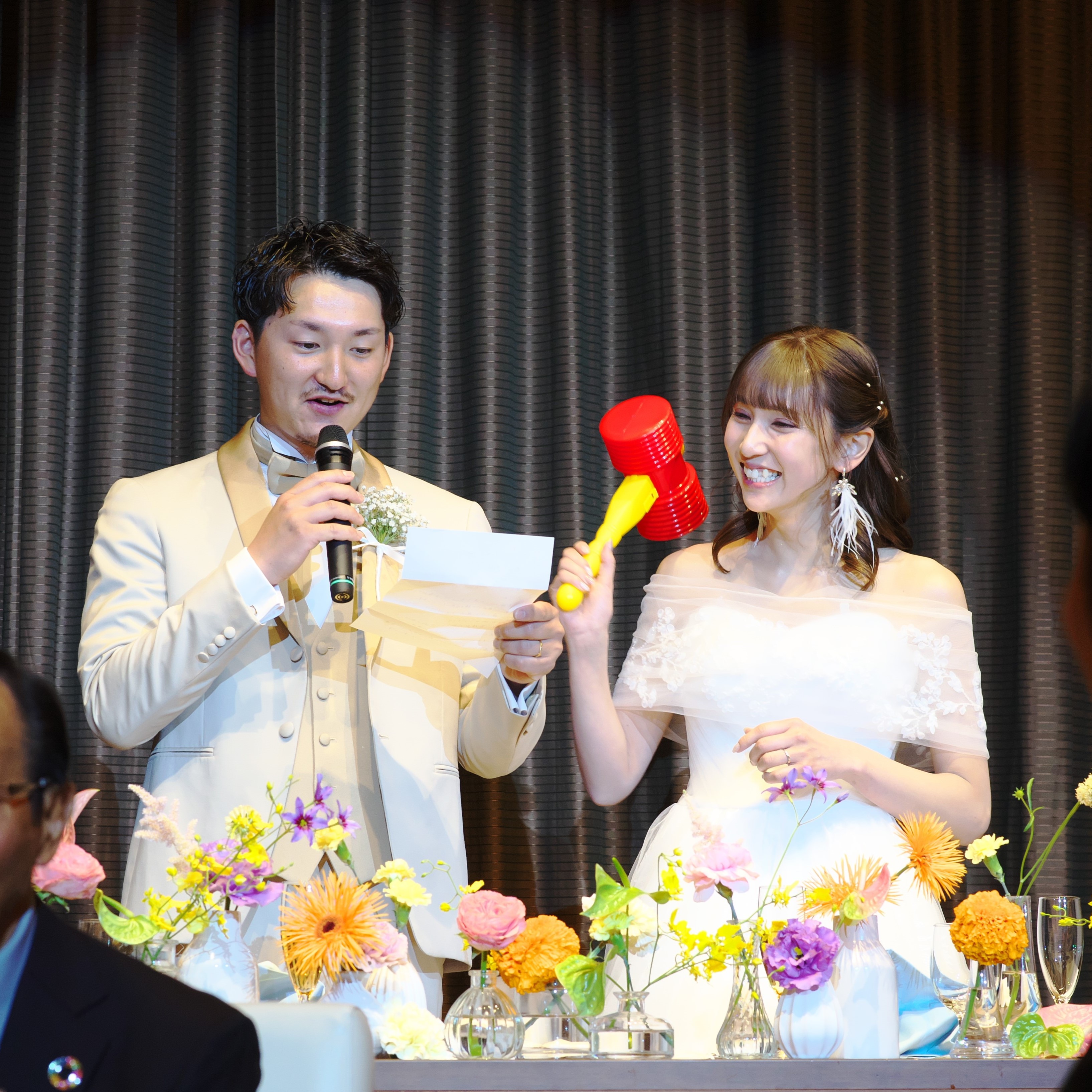 できるだけ他とは被らない、見たことないと思えるような演出をしたいなと思いました。こだわりはレモンサーブ、ぴこぴこハンマーです。ゲストからの反応もよく盛り上がりました。また映像は、入場は新婦 お色直しの入場は新郎とお互いの好きなものを詰め込みました。和と洋を組み合わせることで見ていて飽きない、ワクワクするような映像に仕上げてもらい私たちもとても感動しました。