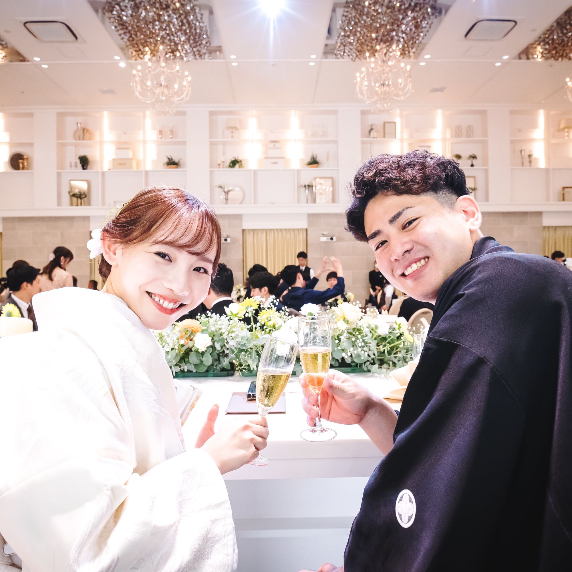 ①バースデーバイトです。結婚式の翌日が父の誕生日だったため、サプライズでバースデーバイトを行いました。驚いていましたが、ゲスト皆さんに祝福していただき、私も嬉しい気持ちでいっぱいでした。②コーラ早飲み対決です。ゲスト全員に楽しんでいただきたいと思い、出場者の内訳を新郎新婦の職場・友人・親族の6名とし、誰が優勝するかを投票してもらいましま。また、当日はメガネストローでの早飲みとし、少しクスッと笑えるような仕掛けになったのではないかと思います。③中座です。新郎新婦、どちらも兄弟での中座でした。中座の際、スクリーンに幼少期の写真を投影していただき、成長を感じながら兄弟揃って歩くことができました。