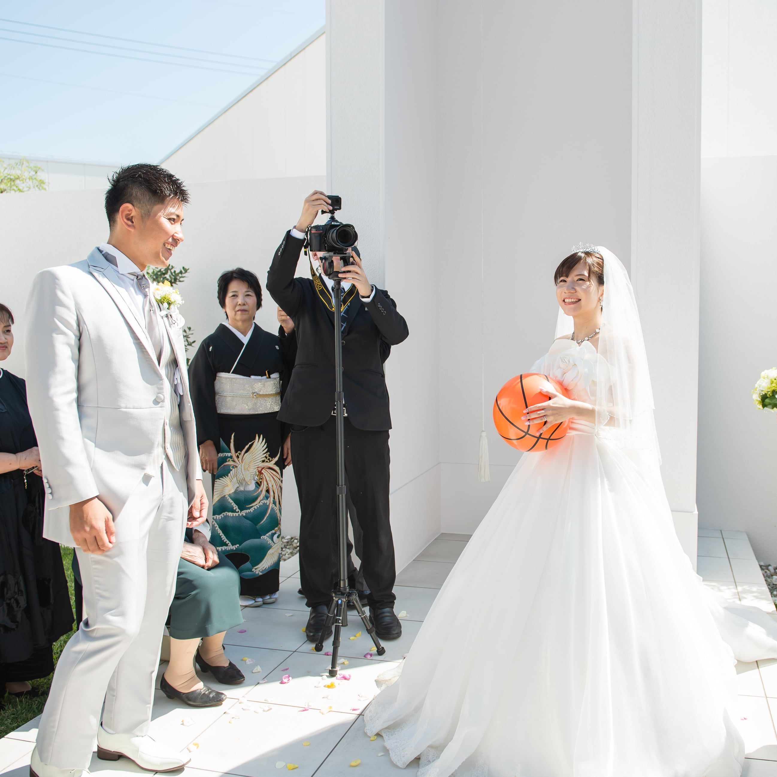 私たちらしい結婚式にしたく、夫婦共通の趣味であるバスケをとりいれたいと、プランナーさんに相談し、ブーケトスの代わりにバスケットボールを投げる『バスケトス』をしました。