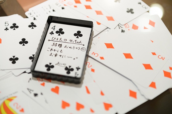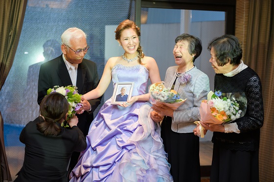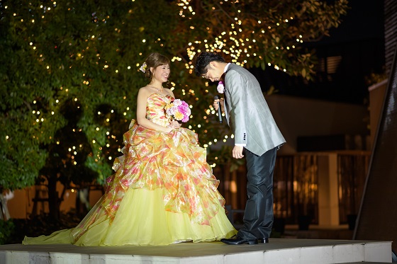 私達は、キャンドルサービスではなくLED点灯を選びました。それは、他とは違う自分たちらしい結婚式(スマイル)にしたかったからです。7色のLEDを点灯させる事で会場の雰囲気も更に良くなり、両親への手紙では感動的なものになり、思い出にも残るものになりました。メインをつけると一斉にゲストのテーブルが7色で光り、とても綺麗で幻想的でした。ゲストの皆さんと思い出を作りたいと思いフォトラウンドにしました。ゲストの方一人ひとりと少しだけでしたが話ができとても楽しかったです。そして、テーブルごとに写真が撮れていい思い出になりました。