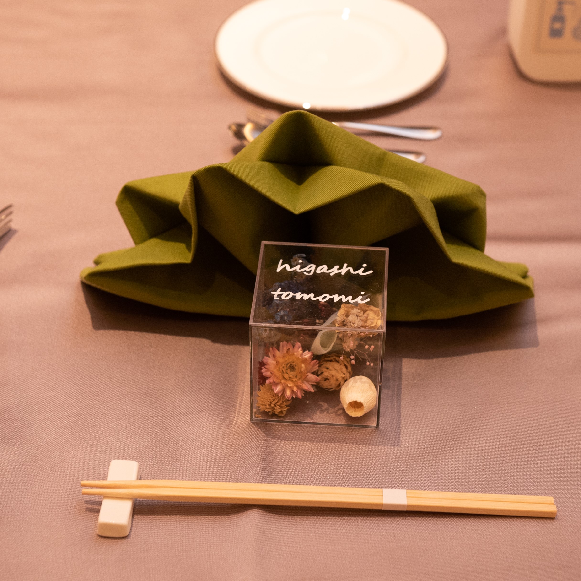 感染拡大を防ぐために親しい友人やお世話になった方を呼んでの披露宴を開くことは諦めたので、大きくテーマというものは決めませんでしたが、家族だけだからこその温かみのある式になればいいなと思っていました。来てくれた感謝が伝わるように席札や色々な小物などを手作りしたのですが、人数が多いとなかなか手作りも大変になったのかなと思います。