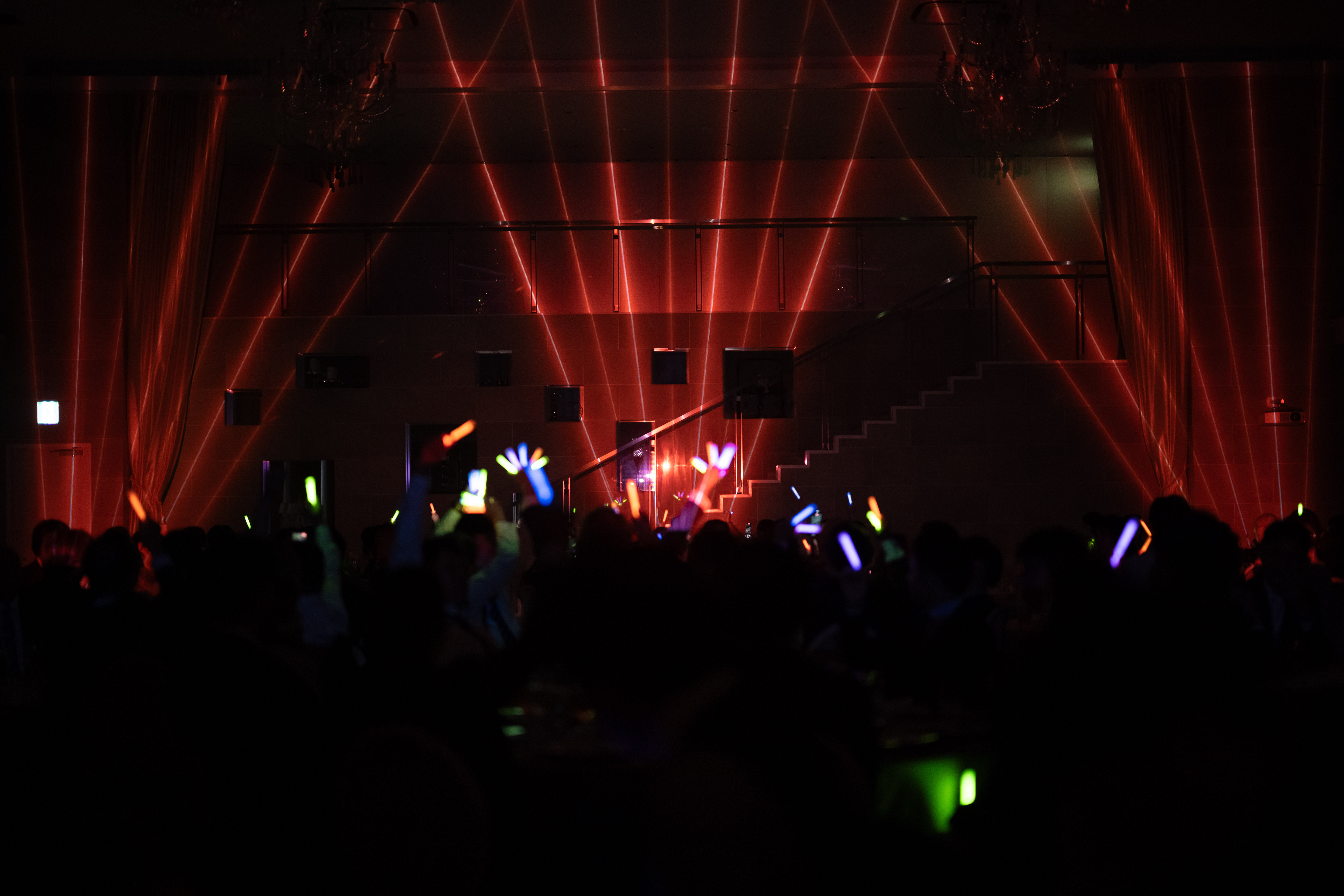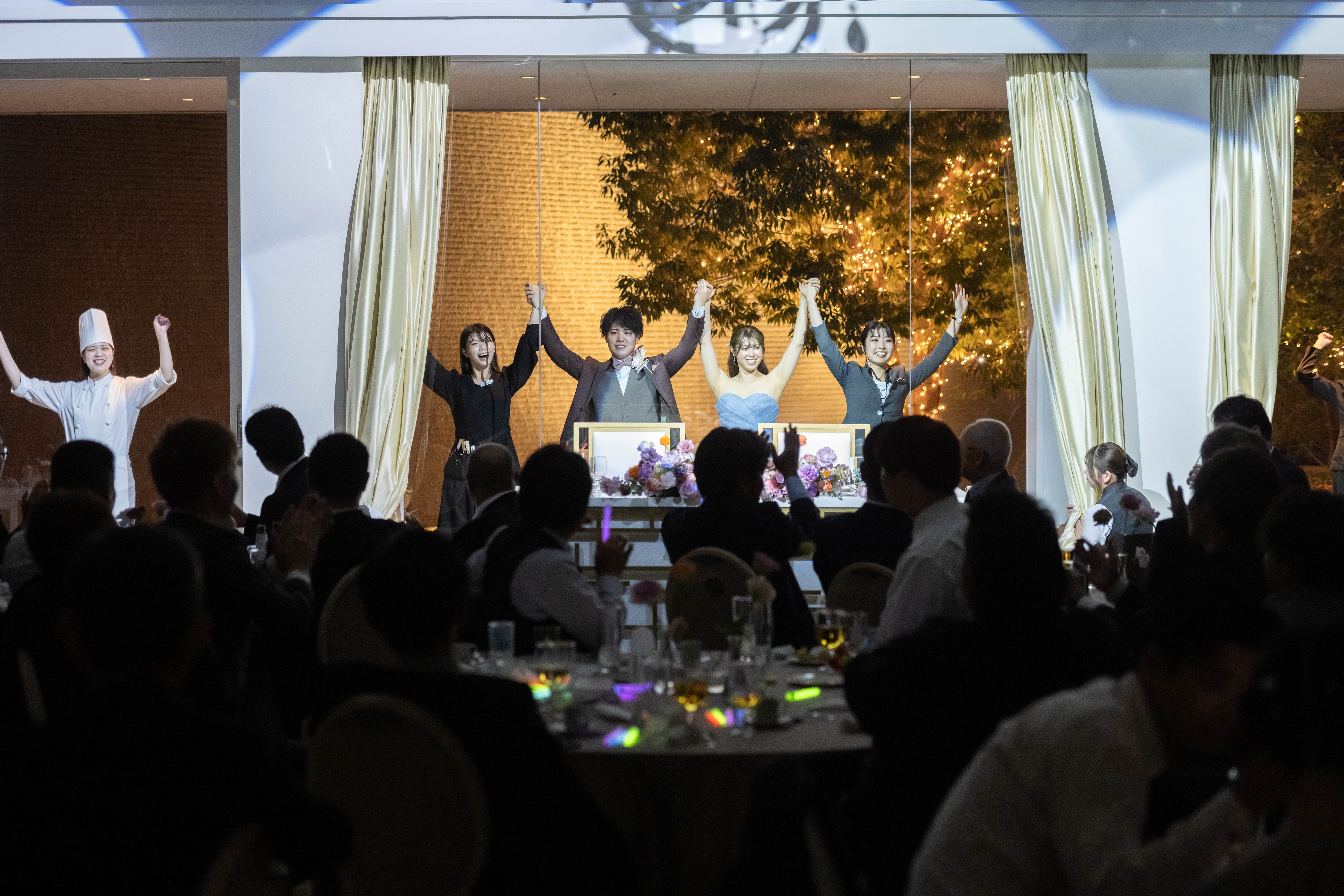 入場と再入場ではどちらもプロジェクションマッピングで登場。前撮りの素敵なお写真を投影しつつ、再入場ではゲストの皆様にペンライトを持っていただき盛大に盛り上がる一幕でした。