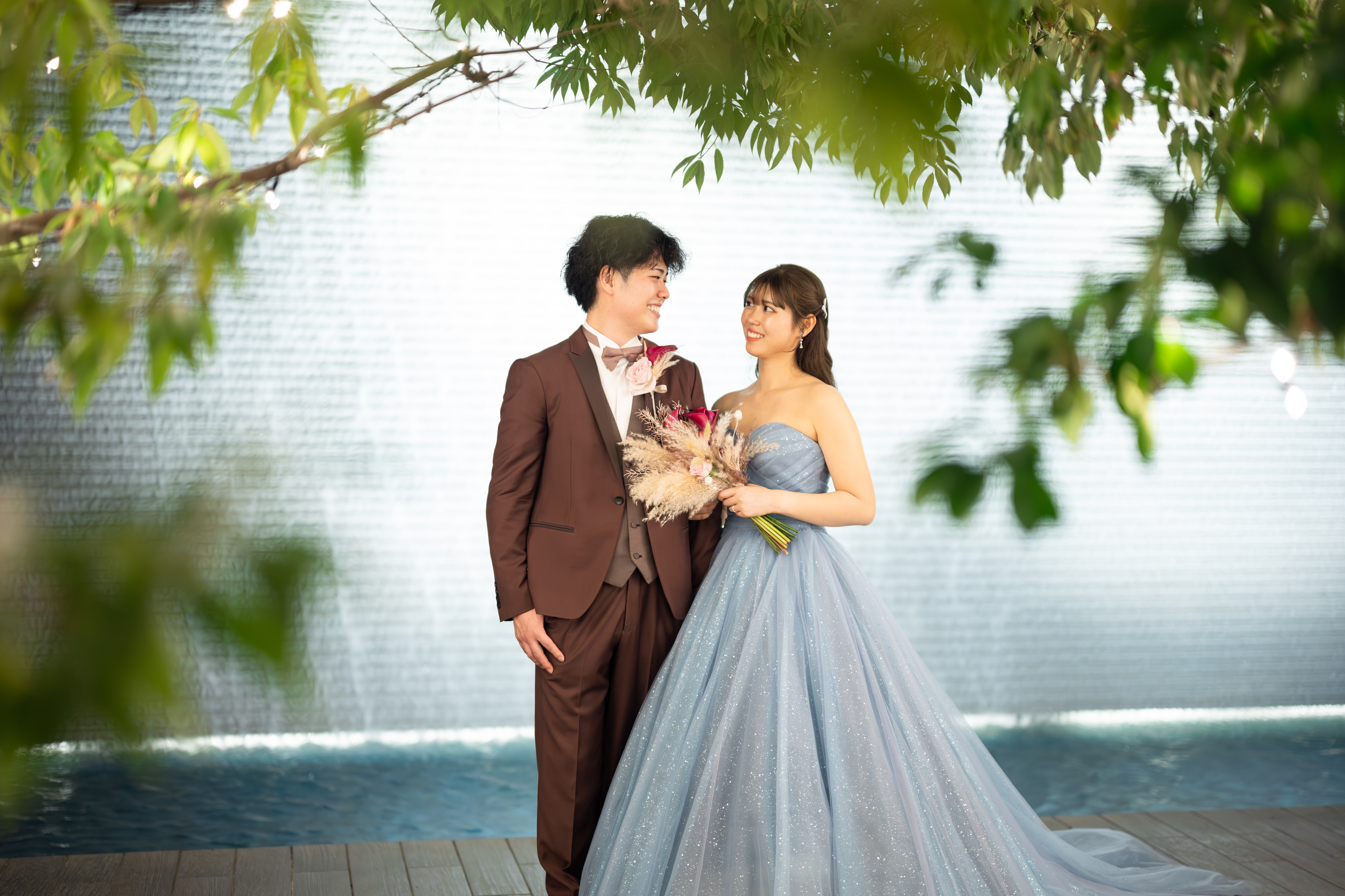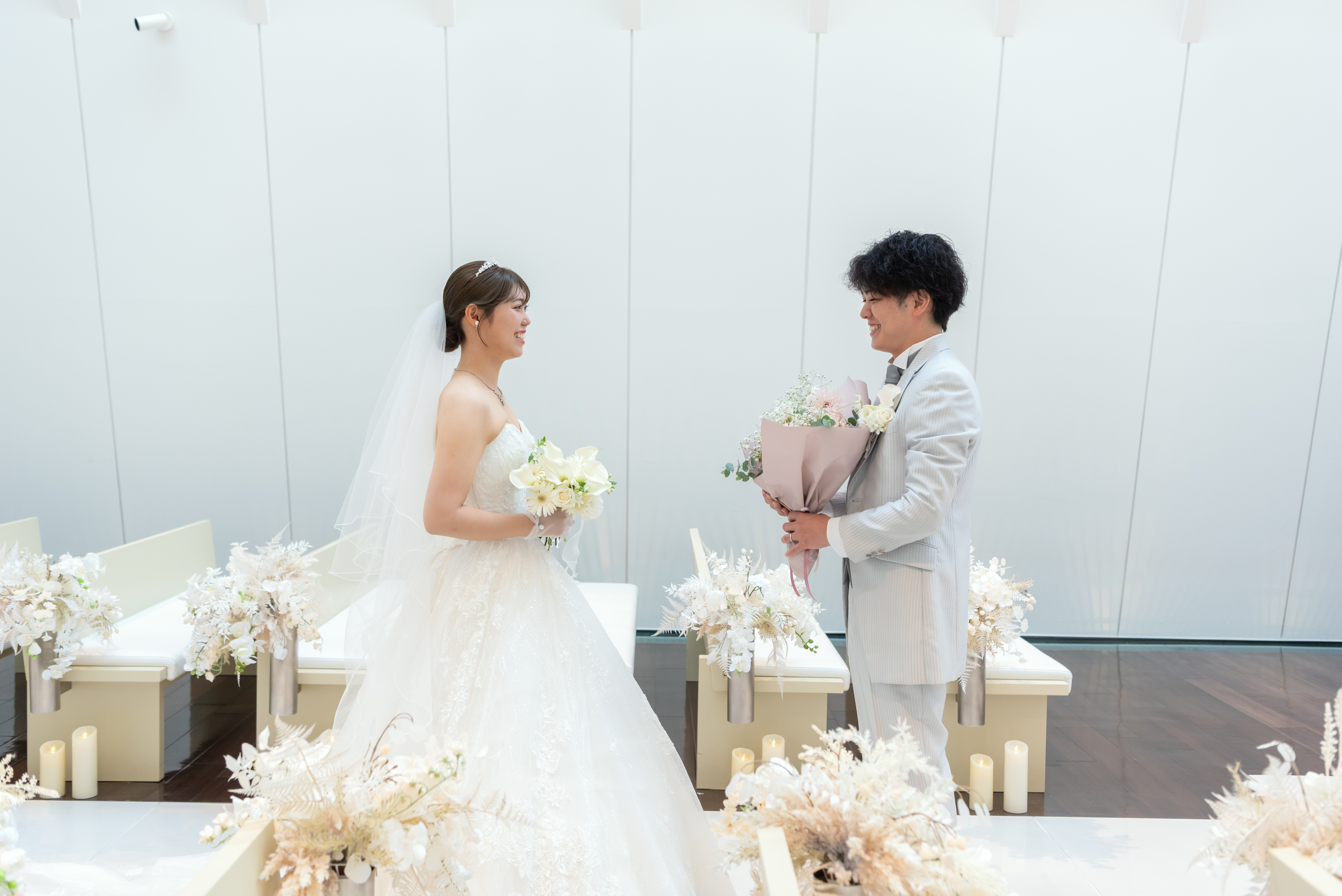 新婦様が後ろを向いている新郎様の肩をトントンとたたくと、振り向いた新郎様の手元にはお花束が。