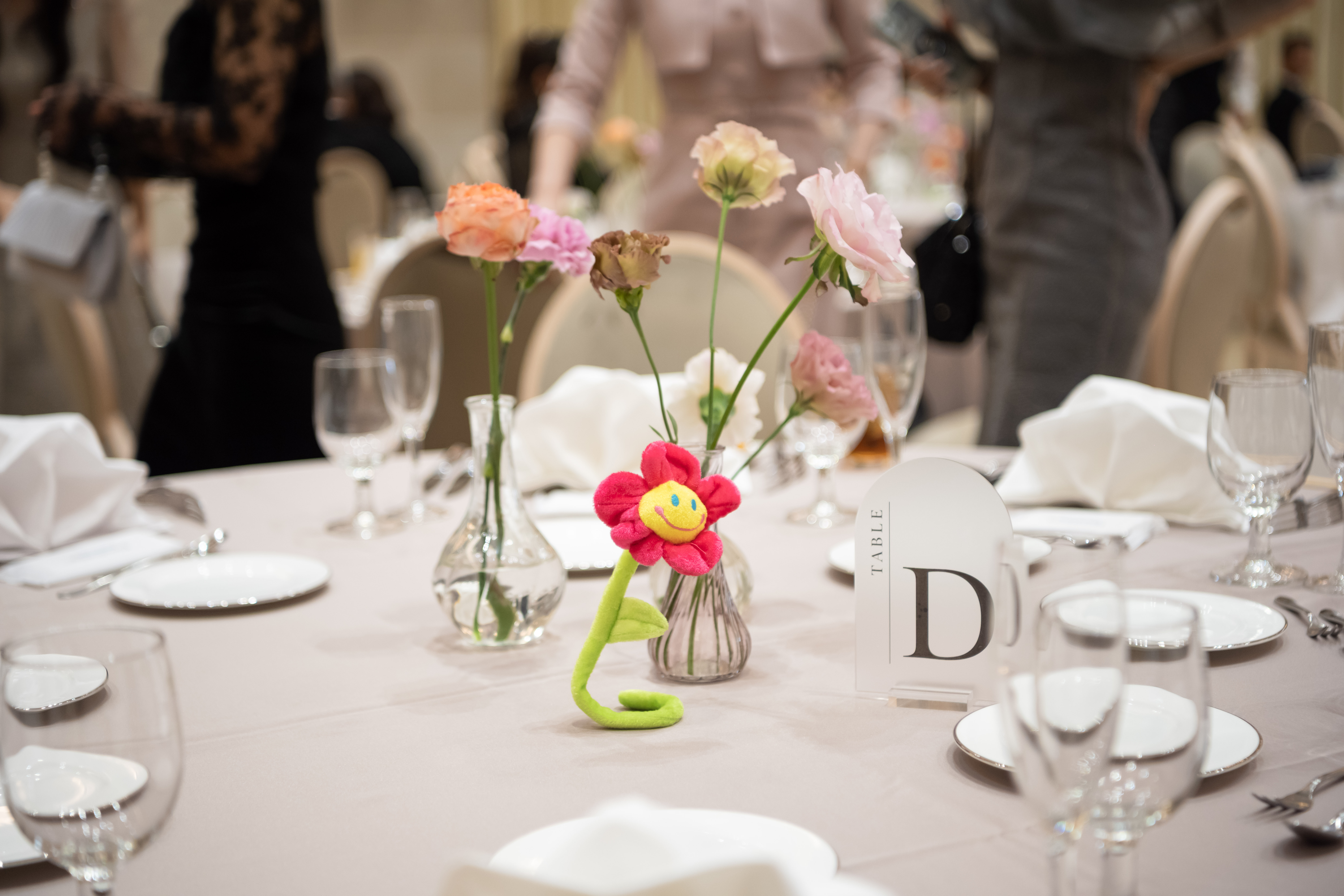 披露宴会場には、お打合せの初めからおふたりがこだわっていらっしゃったぬいぐるみのお花が色違いに全卓に飾られていて、会場スタッフも思わず笑顔になるアイテムでした。