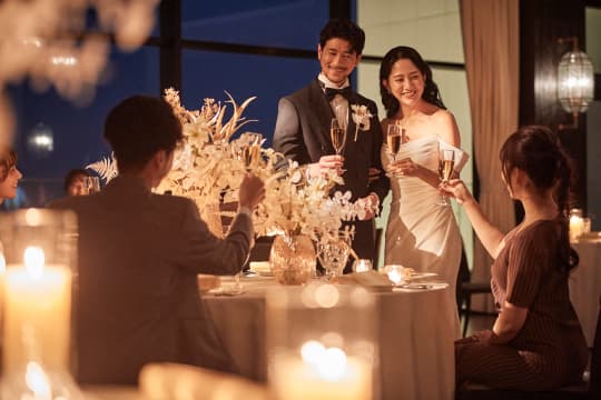 光が優しく差し込む開放的なパーティーはもちろん、幻想的なナイトパーティーなど、おふたりのテーマやご希望に合わせてオリジナリティあふれる演出をご提案いたします。例えば、映像を映し出したカーテンが上がると、マジックウォール(隠し扉)が現れ、そこからおふたりが登場する演出は最高のサプライズに。お好みの音楽を取り入れたり、バーカウンターを使ったりと、おふたりの特別なパーティーに華を添えます。