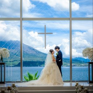 おふたりが生まれ育った鹿児島のシンボル桜島を背景に