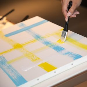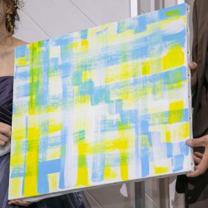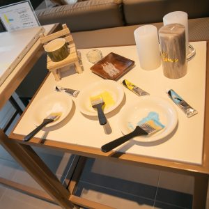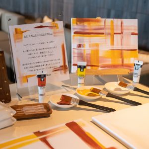 受付に真っ白のキャンバスとカラフルな絵の具。
