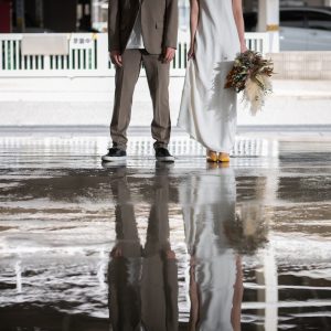 水面に映るおふたりのお写真や鹿児島の歴史を感じられるスポットで