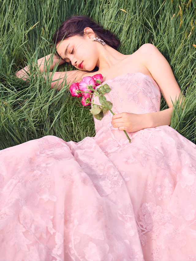 お肌馴染みの良いブラッシュピンクに染めた総レースがロマンティックな1着