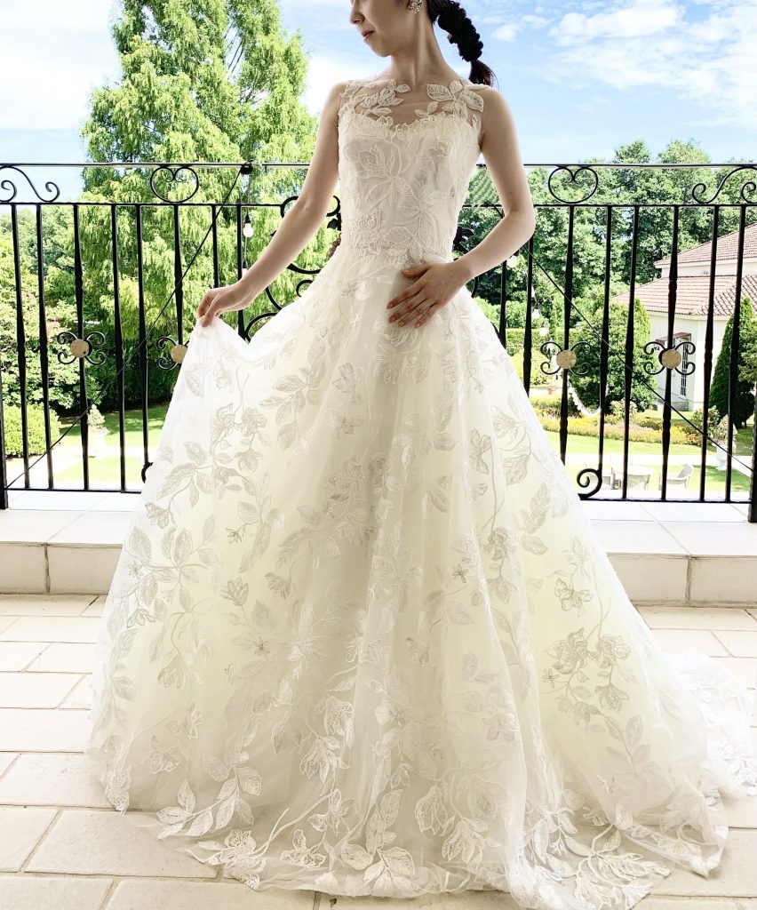 柔らかなチュールの生地にたっぷりと施された繊細なリーフモチーフのレースが