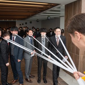 新郎様がゴムを持って、ゲストの皆様にはゴムを加えていただき