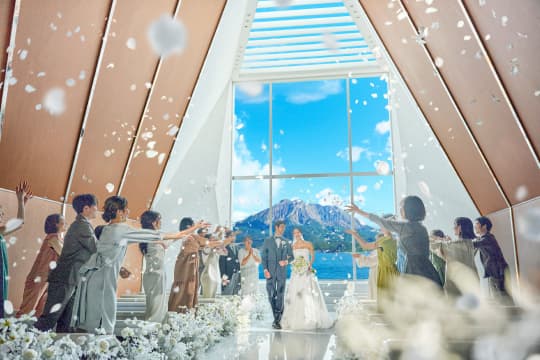 扉が開いた瞬間、目の前に広がるのは一面のオーシャンビュー。まばゆい自然光に包まれながら純白のバージンロードをゆっくり歩んでいくと、桜島の絶景が大きく広がります。その眺めを存分に愉しんでいただくため、聖歌隊は後方上部のオーケストラピットに。高い天井に響きわたる生演奏の美しさも、挙式の感動を盛り上げます。
