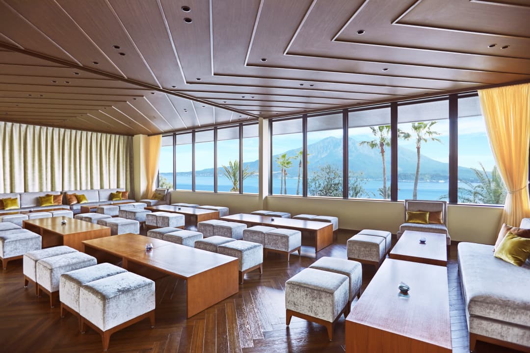 訪れたゲストを最初におもてなしするのは、施設の中で最もワイドに空間を確保し、まるで一枚の絵画のような桜島パノラマビューを実現したこだわりのラウンジ。桜島の美しさを愉しむために設計された特等席は、ゲストへの最初の贈り物です。
