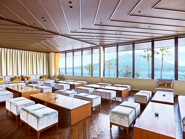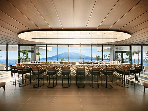 訪れたゲストを最初におもてなしするのは、施設の中で最もワイドに空間を確保し、まるで一枚の絵画のような桜島パノラマビューを実現したこだわりのラウンジ。桜島の美しさを愉しむために設計された特等席は、ゲストへの最初の贈り物です。