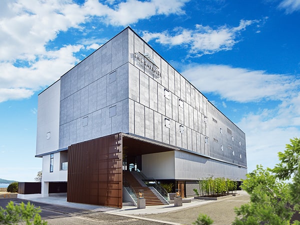 錦江湾に面したウェディングステージ ザ・ベイスイート 桜島テラスの外観は、アートミュージアムを思わせる洗練された佇まいです。入口にはシンボルオブジェが飾られ、これから始まるウェディングへの期待感を高めます。
