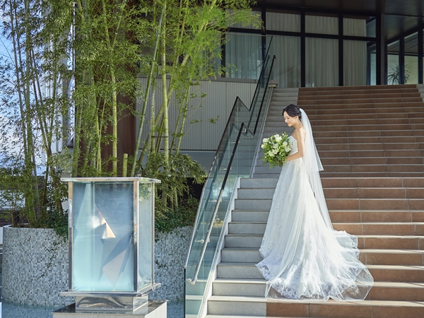 メインエントランスの緩やかな大階段は、ドレスや和装が映えるフォトスポット。大階段を彩る孟宗竹は、ザ・ベイスイート 桜島テラスのシンボルツリーです。その昔、島津藩藩主が貿易で中国から持ち帰ってきた2株が日本全国に広まったと言われ、諸外国の文化を積極的に取り入れてきた薩摩を象徴しています。