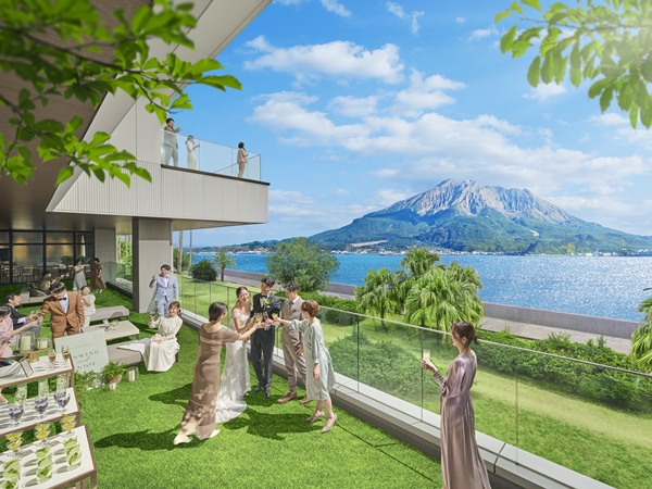 贅沢でゆったりとしたテラスでは、ウエルカムドリンクを愉しみながらくつろいでお過ごしいただけます。心地よい風と桜島の絶景がおふたりのウェディングのファーストシーンを彩ります。