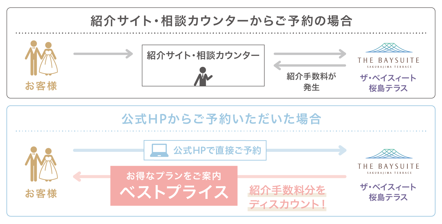 式場紹介・相談カウンターからのご予約や式場比較サイトからのご予約に比べて、当公式HPでご予約いただくと仲介手数料がかからないため、お客様に100%還元したプランをご案内することができます。