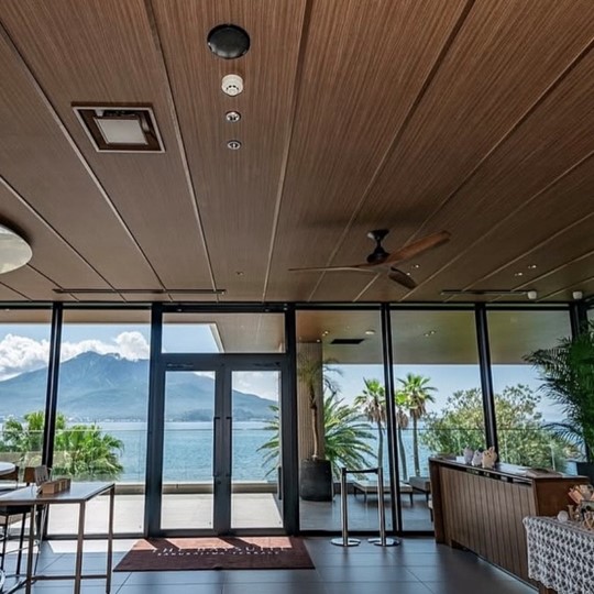 カーテンが開いた瞬間に 一気に自然光と海と桜島の絶景が目の前に広がります。