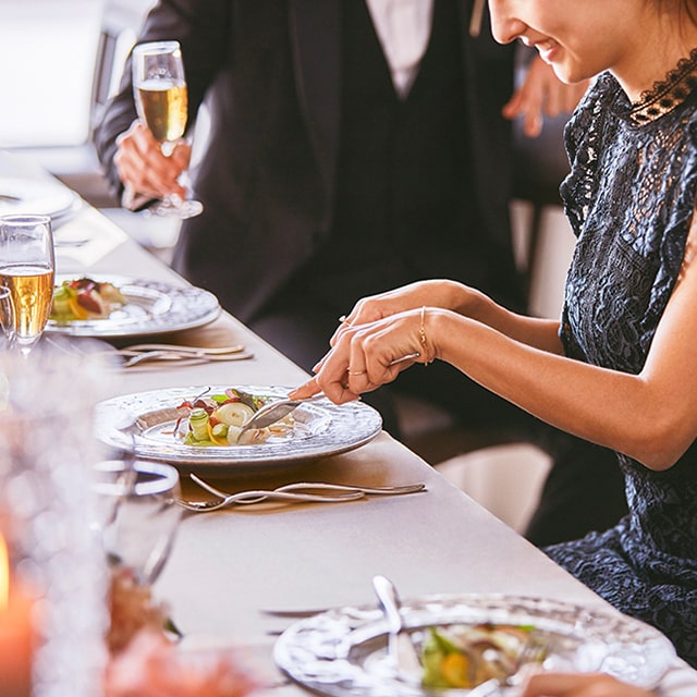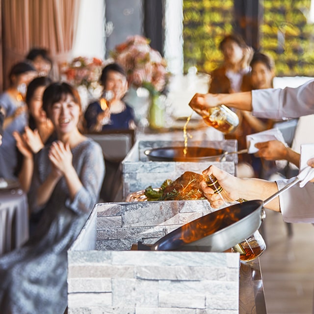 特別なパーティーに華を添えるのが、贅を凝らした料理の数々。宴会・パーティーの様々な趣旨に合わせて料理長が提案させていただくメニューは、味、見た目ともに幅広い年齢層の方にご好評いただいております。例えば、健康セミナーに合わせたヘルシーメニューや、テラスで振る舞うブッフェスタイルのメニューのご提案など、ご要望に合わせてフレキシブルに対応いたします。