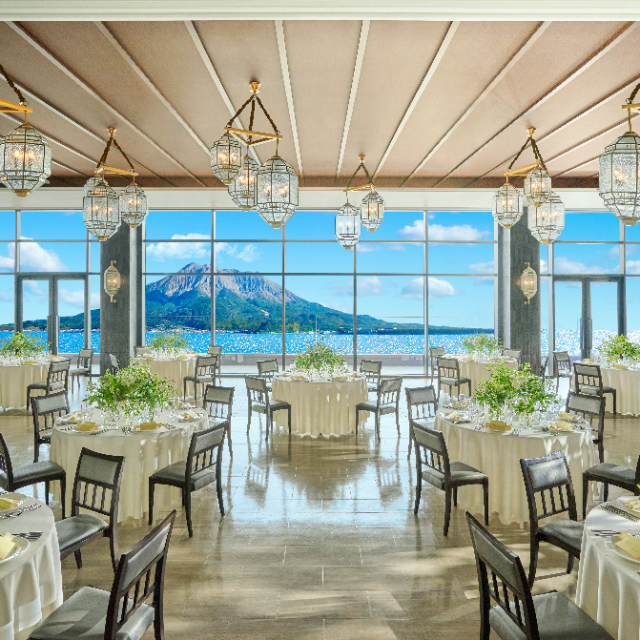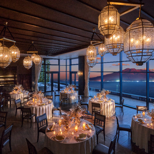 ホワイトを基調とした明るく開放感あふれる吹き抜けのパーティー会場。海側の窓からは桜島の眺めをベストアングルで愉しめ、高さ8mの天井には「逆さ桜島」をデザインしたシャンデリアが輝きます。また、300インチのスクリーンを2つ備え、壁3面を使用した270度のプロジェクションマッピングなど多彩な演出も可能です。プライベートなパーティーからビジネスシーンまで幅広くご利用いただけます。