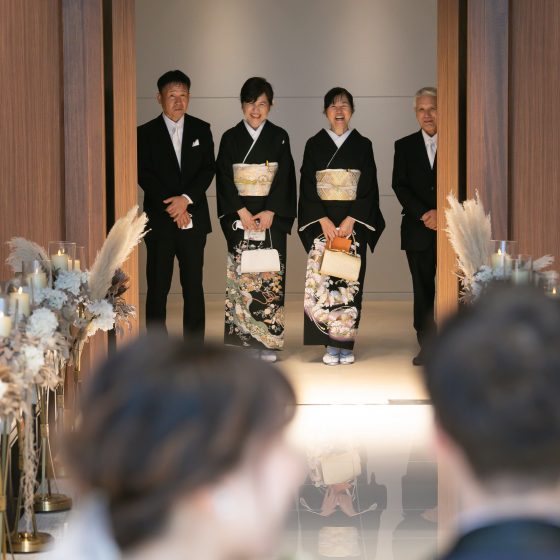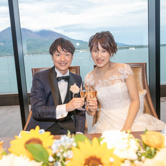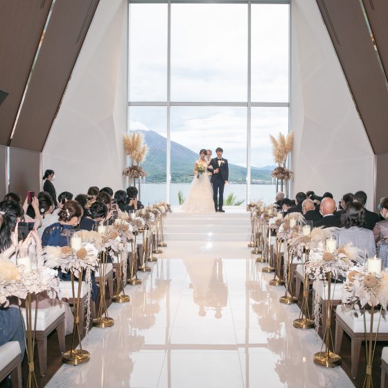挙式が始まり、両親と入場しながら皆の顔が見えてとても嬉しくなりました!披露宴では、雨も上がってきて、だんだん晴れて行く様子もみえて、綺麗な桜島も見ることができました!