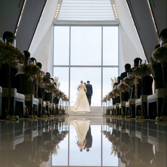 計算して作ったのかはお聞きしていませんが、大きな窓に室内の照明が反射して、まるで海に向かってバージンロードが伸びているように見えました。