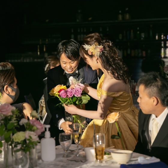 キャンドルサービスの代わりに色とりどりのバラをお渡しし、