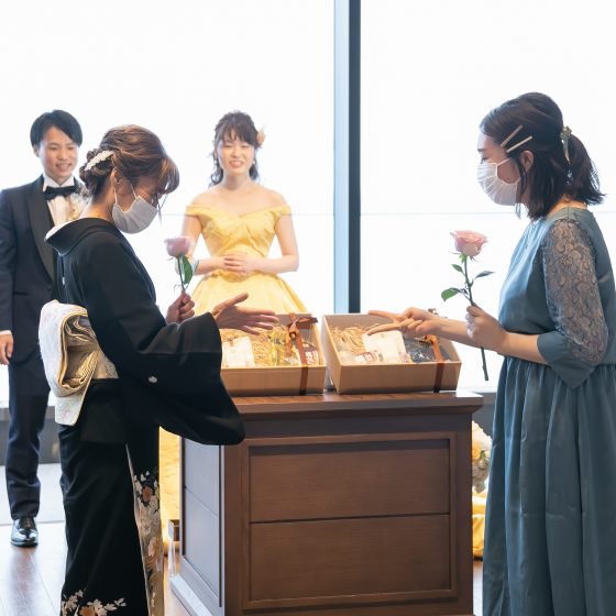 キャンドルサービスの代わりに色とりどりのバラをお渡しし、