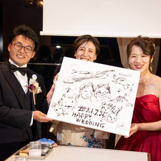 新郎新婦共に県外出身のため鹿児島ならではの余興でゲストに楽しんでほしい、私たちならではの特別感がある演出をしたいという思いから、知り合いの火山灰アーティストの方にお願いして、火山灰を使って新郎新婦の似顔絵をリアルタイムで描いていただきました。