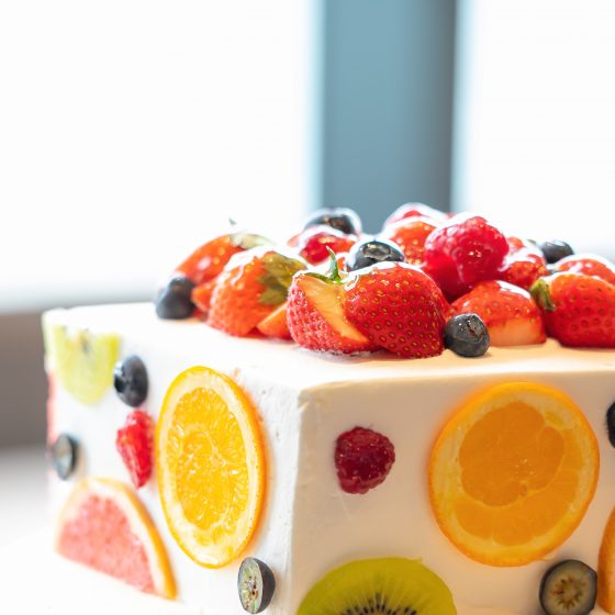離れた席からも見やすいように多段式で、側面にフルーツを入れていただきました。