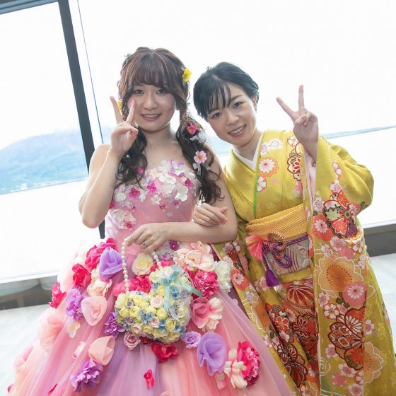 ウェディングドレスとカクテルドレスで印象に差をつけるため、ウェディングドレスはシンプルなサテン生地、お色直しのカクテルドレスは「かわいい」をテーマに華やかでカラフルなドレスを選びました。