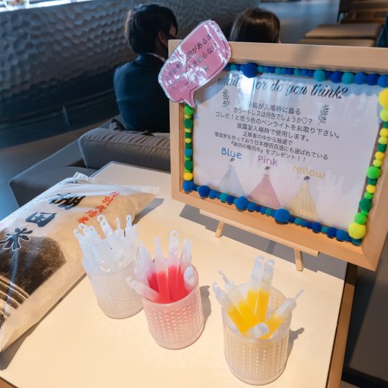 ペンライトには番号をふっており、当選者には鹿児島の特産品で新郎の家でも作っている"棚田米"のお米をプレゼントしました。