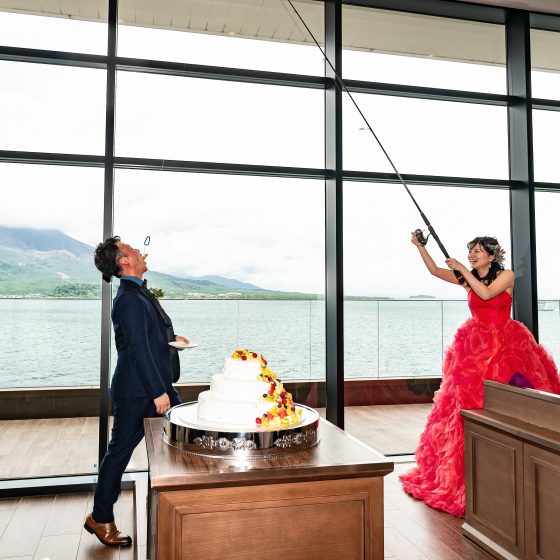 まずブーケトスでは男性陣にも参加してもらいたかったので、新郎が「魚釣り大作戦」を決行しました。