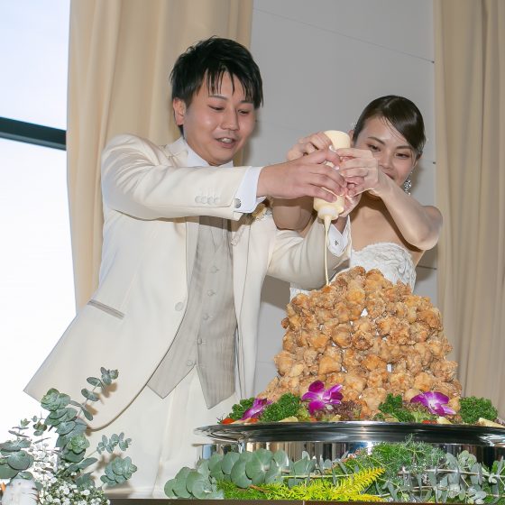【からあげタワー】です!!新郎が甘いものが得意ではなかったのと、ウエディングケーキ以外のものでゲストのみなさんを驚かせたいという思いから木村さんに相談して新婦の大好物のからあげをタワーにしよう!ということになりました。