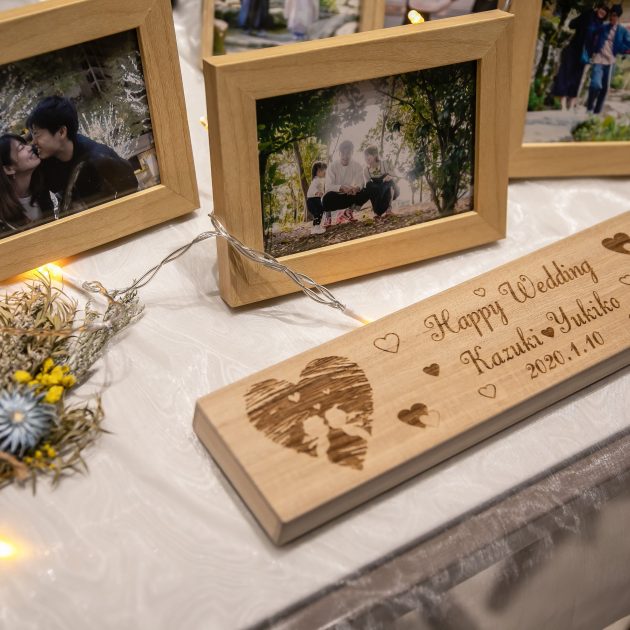 3つ目は、手作りのアイテムです。芳名帳・オープニングムービー・プロフィールムービー・ウェルカムスペース・ブライダル新聞を手作りしました。手作りする中で、思い出話や、お互いの意見を言うことで、改めて夫婦の絆を深めることのできた時間となりました。