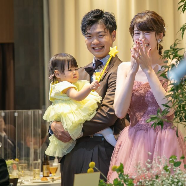 当日は、挙式の入場から披露宴の結びまで緊張しつつも、とても楽しく過ごすことができました。1歳半の娘の行動が予測できなかったため、ぶっつけ本番で頑張るしかないと思っていたのですが、両親の心配をよそに、堂々とリングガールとして歩き、終始落ち着いて1日を過ごしました。娘の成長を最大に見た1日となり、本番に強い娘と、本番に弱い新郎の姿が浮き彫りとなった瞬間でもありました。(笑)