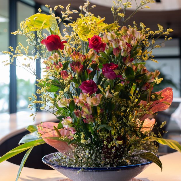 コロナ禍の式でいろいろな制限がある中で、それでも来ていただいたゲストの方には楽しんで頂きたい‼!という気持ちで、会場は花の彩りを明るくし、受付には祖母の活けた花をかざりました。