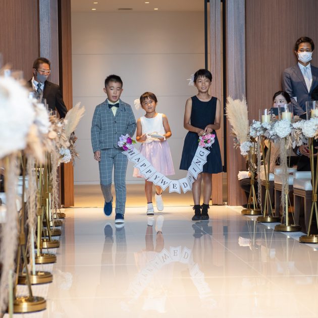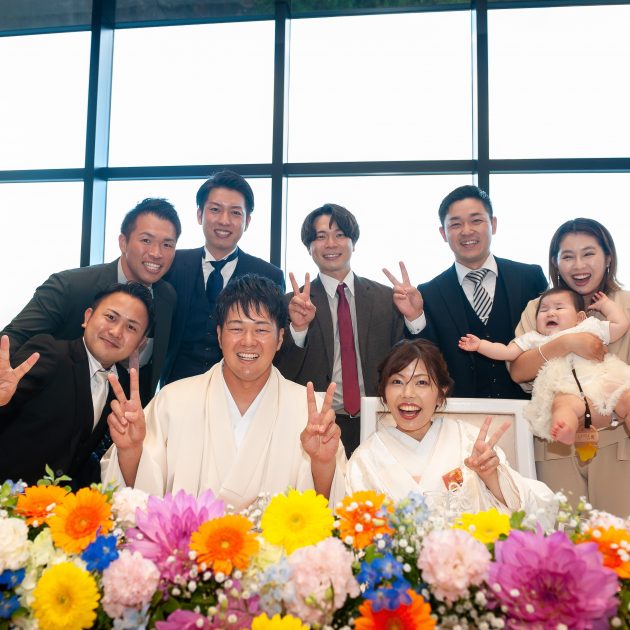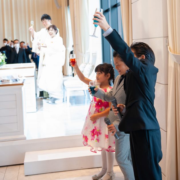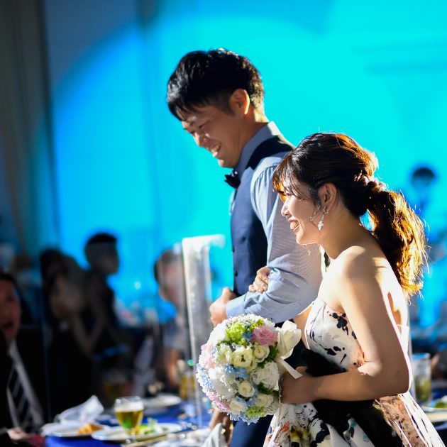 コロナ禍ということもあり、感染対策も入念に打ち合わせしました。式場スタッフの方が消毒液を持って各入口に立ち、入場される方々に手指消毒をお願い・パーテンションの活用など元々感染対策は徹底されていました。その他に、お酌回りをなくすために飲み物のビンを使用しないこと・マスクやウェットシートの準備などゲストの方が安心して過ごせる環境づくりに努めました。