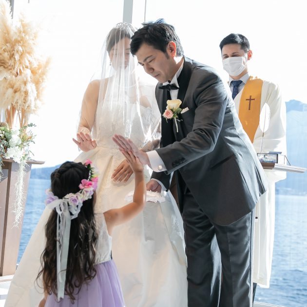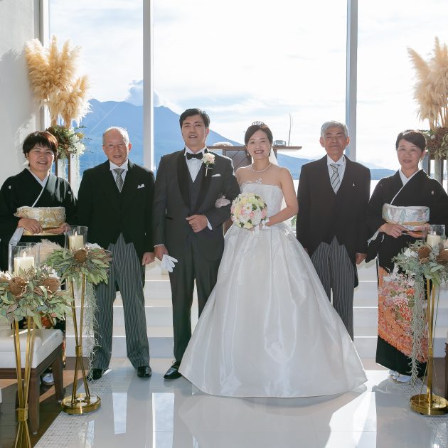 当日は朝、雨が降っていましたが挙式が始まる頃には、いい天気になり桜島も綺麗に見えて良かったです。ペアレントタイムの時には両親ともに私たちと会った瞬間涙ぐんでくれて親とステキなときを過ごせました。コロナで延期した時には、結婚式が無事にできるか毎日心配していましたが、たくさんの方々に来てもらい祝福して貰えたことがとても嬉しかったです。この日を迎えるまでに、担当の足立さん・西さんには色々とアドバイスやアイディアをもらい一生忘れられない1日になりました。終わってから、来てくれたゲストが「とてもいい式だった」と会う度に言ってくれるので、結婚式をベイスイートでできて本当に良かったです。また、ベイスイートに行ける日を楽しみにしています。