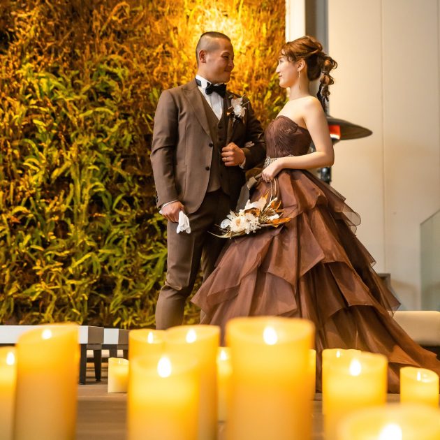 お色直しでは、新郎と新婦の衣装のカラーをブラウンで合わせました。