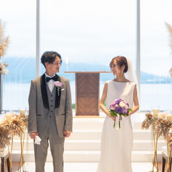 実際に式場を見学に行った際、広々としていて開放感のあるラウンジに圧倒されたのを覚えています。県外にいる友達を招待したかったので、式場内のどの会場にいても鹿児島のシンボルである桜島が綺麗に見えるベイスイートさんの会場は本当に理想的でした。高級感のある内観も両親や祖父母からも好印象を持ってもらえる気がしたので、見学をして改めて「ここで結婚式を挙げたい!」と思い、他式場を見学をしないまま見学当日に決めました(笑)ですが、その時の直感を大事にして大正解でした!