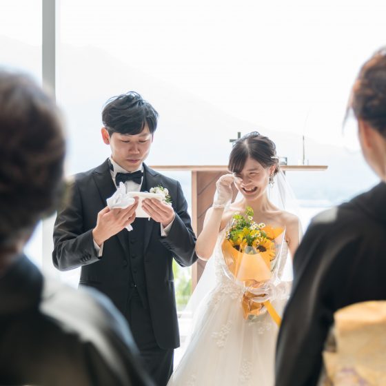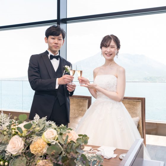 式場内どこからでも桜島がよく見え、特にチャペルから見える桜島の景色は1番のお気に入りになりました。また、目の前が錦江湾ということもあり開放感があるのもよかったです。式場全体の雰囲気も落ち着いていて、特にテールの披露宴会場の木目調が素敵でした。