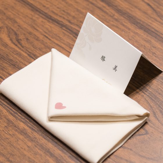 ナフキンを手紙の形に折り、中にゲストの方々へのメッセージカードを入れました。これは、初めて見学に行ったときの試食会でベイスイートのスタッフの方のアイデアで用意していただいたもので、ぜひ当日も取り入れたいと思いました。また、ウエディングケーキも手紙の形にしてもらいました。ふたりの写真をプリントしたクッキーを切手に見立てた切手セレモニーや結婚式当日の日付の入った消印クッキーなど細かいところにもこだわってみました。