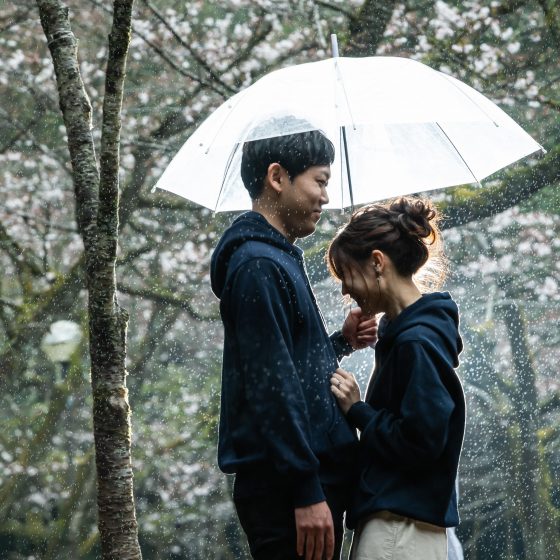 ストーリーフォト。2人の思い出の場所である慈眼寺公園でストーリーフォトをしました。ネモフィラを背景にした写真や、私服を着てデートを再現した写真を撮りました。また、当日は小雨が降っていたので傘をアイテムとして取り入れたりと、その時の状況で色々な写真が撮れたのでオリジナリティのあるものになりとても楽しかったです。