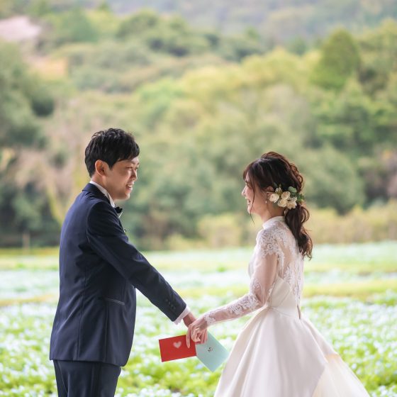 ストーリーフォト。2人の思い出の場所である慈眼寺公園でストーリーフォトをしました。ネモフィラを背景にした写真や、私服を着てデートを再現した写真を撮りました。また、当日は小雨が降っていたので傘をアイテムとして取り入れたりと、その時の状況で色々な写真が撮れたのでオリジナリティのあるものになりとても楽しかったです。