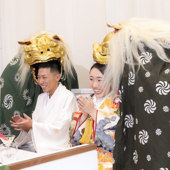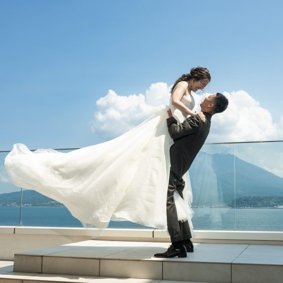 また、桜島背景のチャペルと披露宴会場。県外からの参列予定者も多かった為、鹿児島を代表とする桜島を見ながら美味しい食事を楽しんでいただけるなとイメージできたのも決め手です。そして演出関係の豊富さ、クオリティがブライダルフェアの時に驚きました。 実際にフェア参加者と披露宴会場にてマッピングを見て、映像のクオリティ、音の良さ、映画館、アトラクションを超えると言っても過言ではない演出で鳥肌が止まりませんでした。その他にも式場内は段差がない、徹底されている清潔さ等々優しさを感じる部分が多くあり、当日に最高のおもてなしができると確信できました。