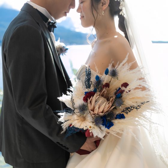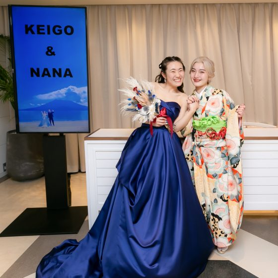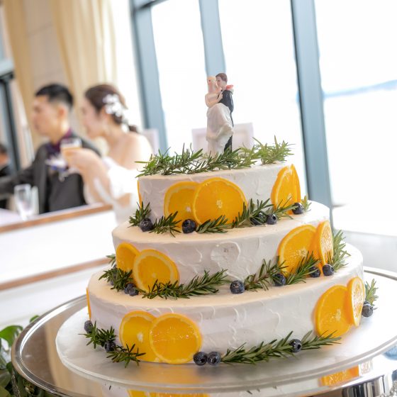 演出を妥協せず、やりたいこと、したいことを全て取り入れました。 デジカム、オープニングムービー、270度マッピング、プロフィールムービー、階段マッピング、獅子舞演出、ジェットスモーク、エンドロール、BGM、音抜きのタイミングで入場等、そのお陰で当日ド派手な演出にすることができ、列席者の方々や他県の結婚式関係者から、「もう一度みたい」、「どうやって制作するのか」、様々なお言葉を頂戴することができました。、出来上がった動画を何回も見返す程素晴らしい映像を作っていただいたクリエイターの皆様に感謝です。 料理に関しては、フルコースの試食会に参加して、何度も何度も話し合いをして美味しいは勿論のこと、鹿児島の旬の食材を活かし、作品のように美しく盛り付けられ、見た目にも愉しんでいただける五感に響く一皿になるようにこだわりました。 ウェディングケーキにもこだわりたく、何度もデザインを打ち合わせてイメージ通りのものをオーダーしました。 本当にかわいくて素敵なケーキになったので、列席者の方もたくさん写真を撮ってくれました。 担当プランナーの木村さんをはじめ、ベイスイートのスタッフの方々はわたしたちの要望やこだわりを受け止め、形にしてくださいました。本当に感謝しています!